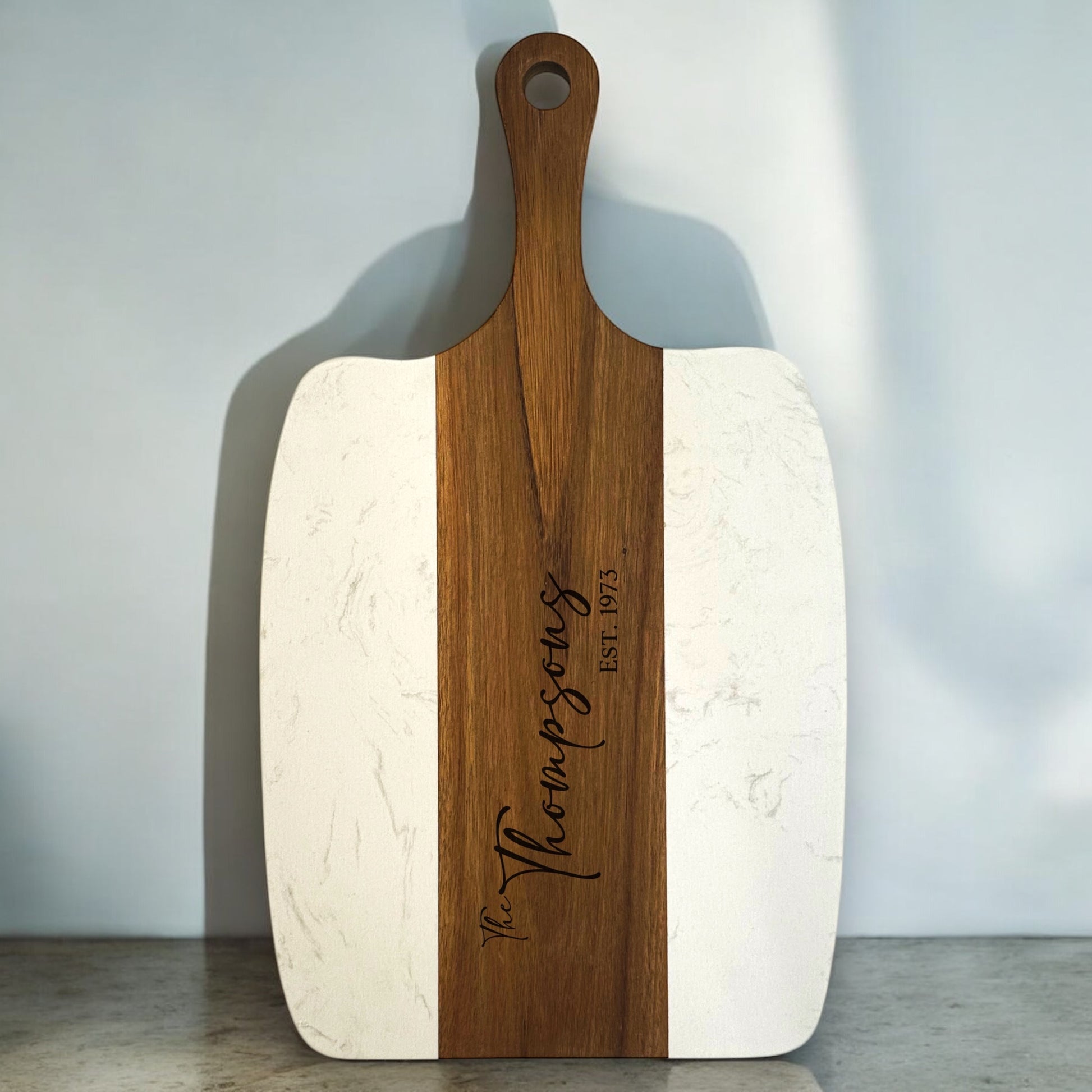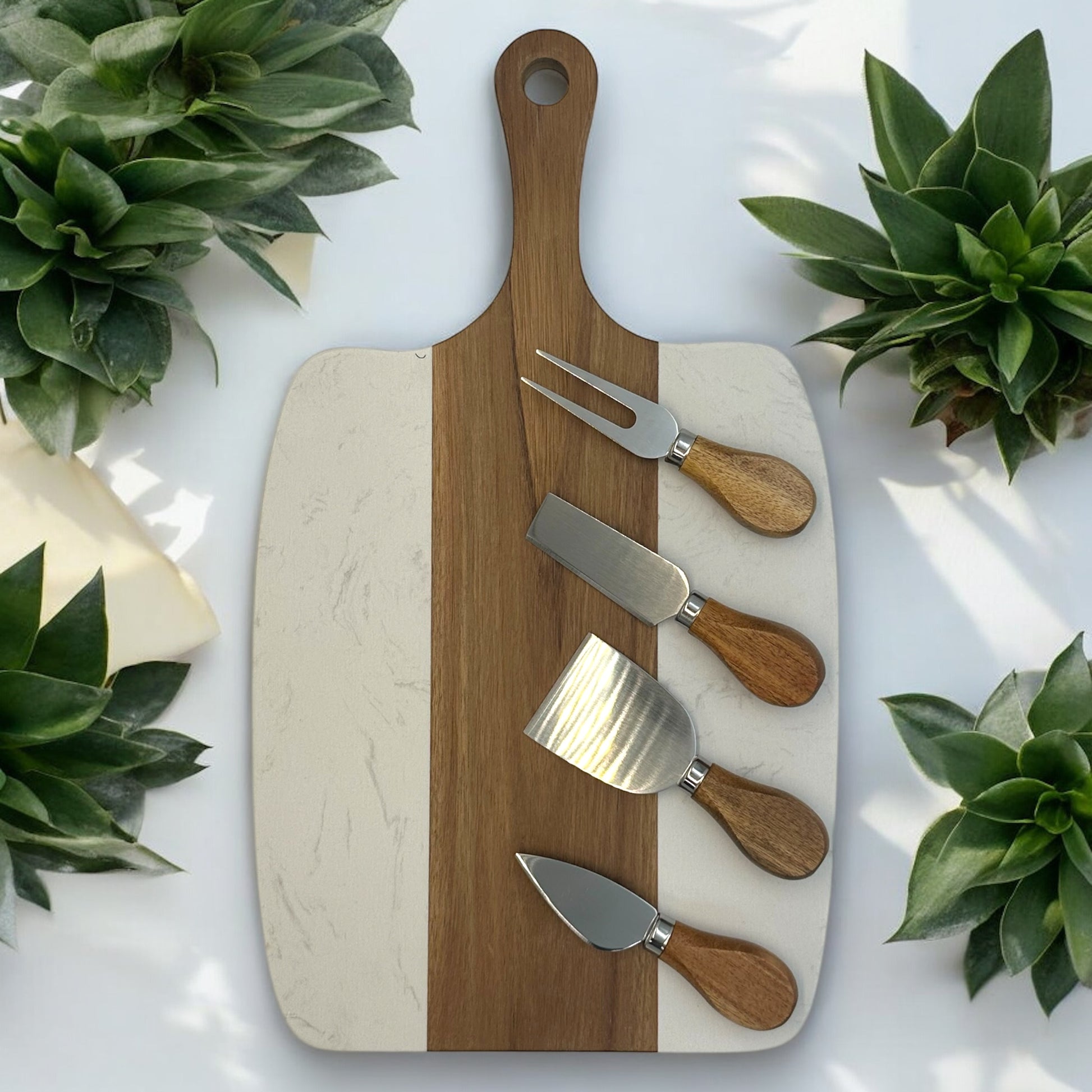 Our marble acacia serving board with utensils offers a great value giving you a large serving area with a personalized acacia stripe and a handle with a hold for hanging or displaying in your home. 4 utensils are included. 6 designs with personalization are available on this item.